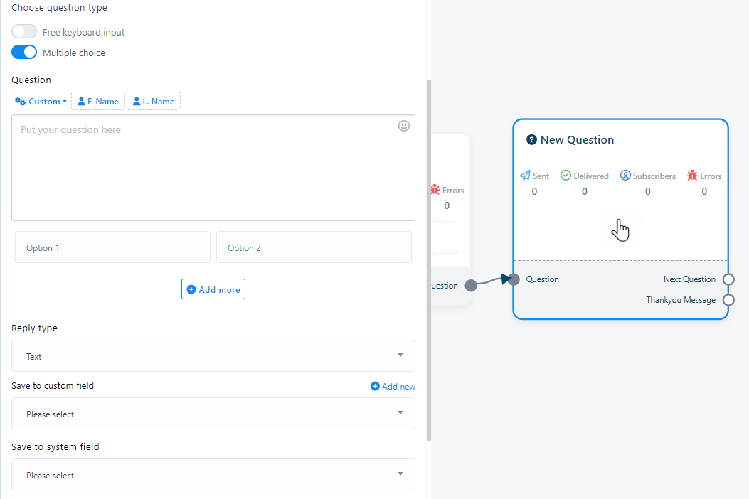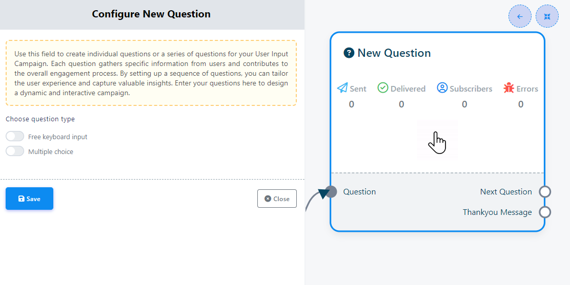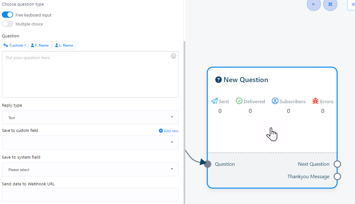 - Double-click on the `New Question` component to access two buttons: `Free Keyboard Input` and `Multiple choice`. These buttons determine the type of questions you want to ask.